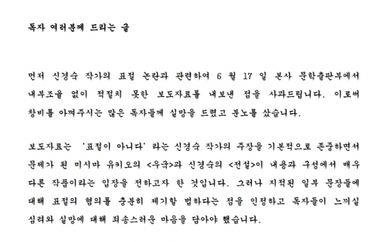 창작과 비평은 "먼저 신경숙 작가의 표절 논란과 관련해 6월17일 본사 문학출판부에서 내부조율 없이 적절치 못한 보도 자료를 내보낸 점을 사과드립니다. 이로써 창비를 아껴주시는 많은 독자들께 실망을 드렸고 분노를 샀습니다"고 말했다.