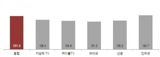 매체별로 살펴보면 지상파TV 108.4, 케이블TV 104.8, 라디오 101.2, 신문 105.2 인터넷 124.7을 나타나고 있어 5대 매체 모두가 KAI 지수 100을 넘겨 전월 대비 증가세를 보일 것으로 전망된다.