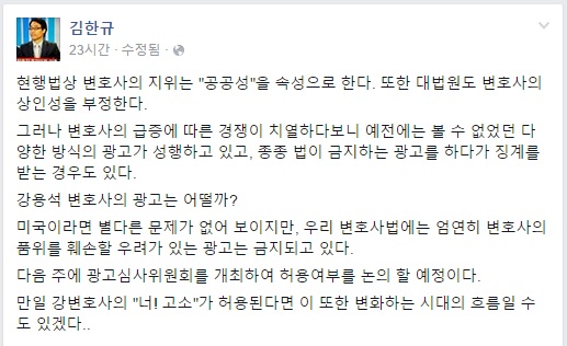 김한규 서울지방변호사회 회장은 지난 16일 개인 SNS 계정을 통해 "다음 주 광고심사위원회를 개최해 허용 여부를 논의 할 예정"이라 밝혔다. 강용석 변호사는 국회의원 시절의 사진과 '너! 고소'라는 자신의 문구를 이용해 광고 포스터를 제작해 네티즌들 사이에서 화제가 됐었다.