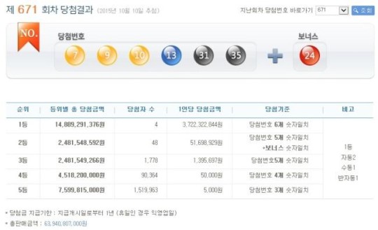 10일 나눔로또 공식 홈페이지 등을 통해 발표된 제671회차 로또당첨번호는 7, 9, 10, 13, 31, 35로, 당첨자 4명은 1인당 37억 2232만 2844원을 수령한다.