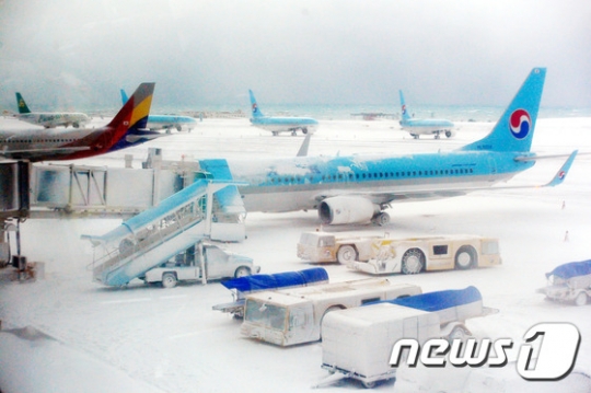 제주지역에 내린 많은 눈으로 24일 제주국제공항 활주로에 눈이 쌓여 운항을 포기한 항공기가 멈춰서 있다. /사진=뉴스1