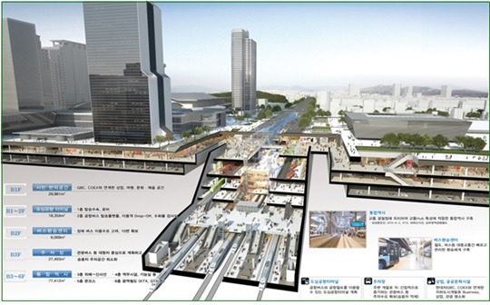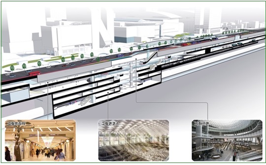 이곳에 ①통합철도역사 ②지하버스환승센터 ③도심공항터미널 ④주차장 ⑤상업· 공공문화시설 등 복합적 기능의 공공 인프라가 들어서게 된다.