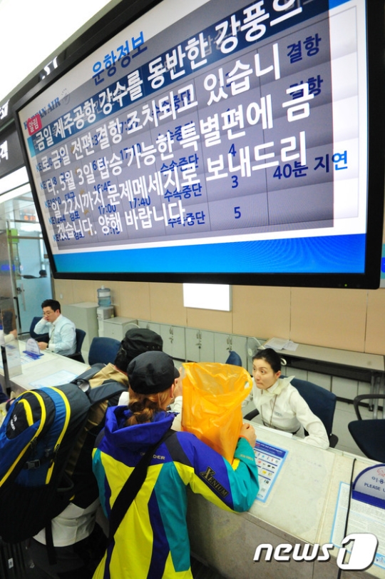 뉴스1의 2일자 보도에 따르면 2일 오후 1시 30분 제주에서 김해로 가려던 에어부산 항공기가 강한 바람으로 인해 결항되는 등 오후 4시 20분 현재까지 출발 8편과 도착 5편 등 13편이 결항됐다.