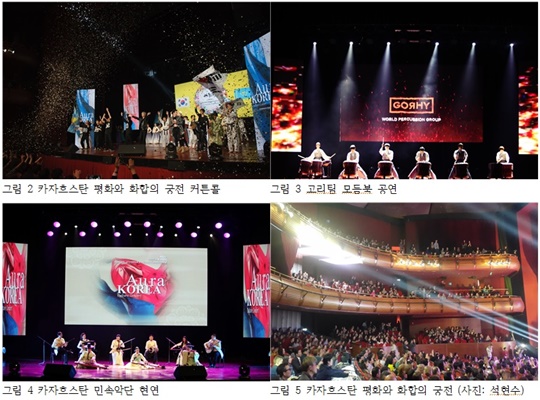 한국 문화사절단은 지난 3월 29일과 31일, 카자흐스탄과 타지키스탄에서 대규모 공연을 펼쳤다. 공연 <아리랑, 카라반의 심장을 두드리다>는 정부의 유라시아 이니셔티브 사업의 시작으로 외교부와 문화체육관광부가 주최하였다. 이 공연은 총 4회 상연됐으며, 약 7000여명의 관람객이 찾아 대성황을 이루었다.
