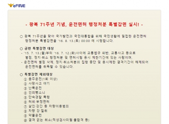 경찰청은 13일 광복 71주년을 맞아, 운전면허 행정처분에 대한 특별감면을 실시한다.