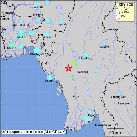 미국 지질조사국(USGS)은 24일(이하 현지시간) 오후 5시께 미얀마 중부 마궤주(州) 차우크에서 서쪽으로 25㎞ 떨어진 지점에서 규모 6.8의 지진이 발생했다고 밝혔다.