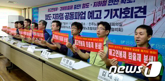 노조원들이 파업 예고 기자회견을 가지고 있다 /사진=뉴스1
