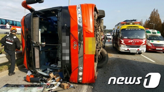 뉴스1에 따르면 6일 오전 9시 30분께 부산방향 회덕분기점 인근에서 이모(55)씨가 운전하던 관광버스 1대가 앞으로 끼어든 차를 피하려다 전도됐다.