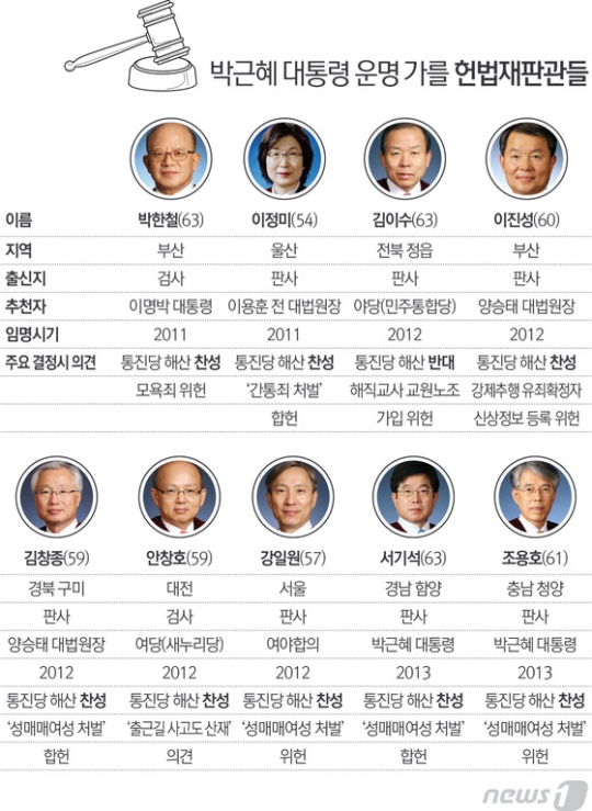 [탄핵 가결] 박근혜 대통령 운명 가를 헌법재판소 9인, '진보·보수' 성향은?