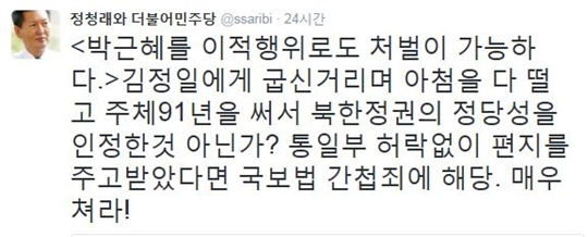 박근혜 대통령이 과거 故 김정일 국방위원장에게 편지를 보냈다는 보도가 나와 파문이 일고 있다. 이와 관련해 정청래 전 더불어민주당 의원은 "이적행위로 처벌 가능하다"고 일침을 가했다.