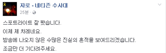 세월호 침몰 원인 분석 다큐멘터리 '세월x'를 제작한 네티즌 수사대 '자로'가 본인이 출연한 JTBC의 이규연의 스포트라이트를 잘 봤다고 밝혔다. 이어 수많은 진실을 보여주겠다고 예고했다.