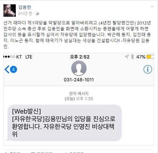 김용민은 17일 개인 페이스북에 입당 사실을 알리며 "태극기가 넘실대는 세상을 건설하자"고 비꼬았다.