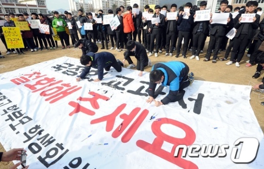 '문명고 국정교과서 지정철회 대책위원회'(문명고 대책위)에 따르면 문명고 입학 예정 신입생 김모군(16)은 이날 오전 학교에 입학 포기 의사를 전했다. 지난달 납입한 등록금(41만9320원) 반환까지 요구했다.