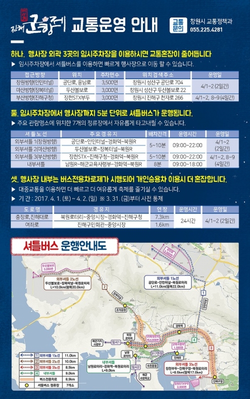 창원시는 우선 창원, 마산, 부산방향 행사장에 각 3000대 이상 수용이 가능한 임시주차장을 마련했다. 또 교육사령부, 장천 부두 등 임시주차장을 지난해보다 2600면 추가한 1만 6200면을 확보했다.