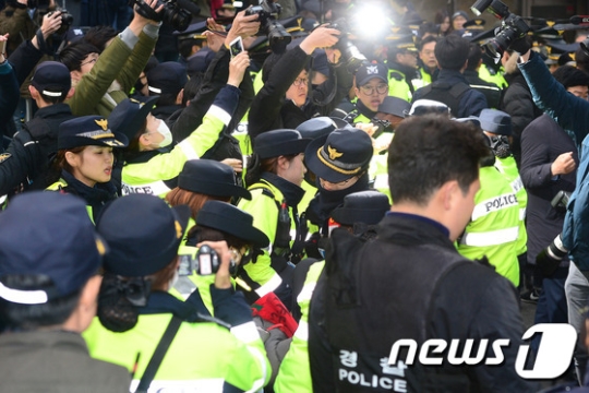 박근혜 전 대통령이 검찰에 출두하는 21일 오전 서울 강남구 삼성동 박 전 대통령 자택 앞에서 박 전 대통령의 지지자들이 경찰과 충돌하고 있다./사진= 뉴스1