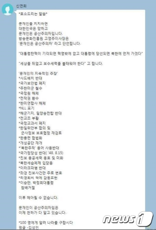 해당 글에는 '문재인의 지속적인 주장'이라며 사드배치 반대, 국가보안법 폐지, 주한미군 철수, 국정원 해체, 전작권 환수, 한미연합사 해체, NLL 포기 등을 언급하며 "문재인이 공산주의자임은 이제 천하가 다 알고 있다"고 돼 있다.