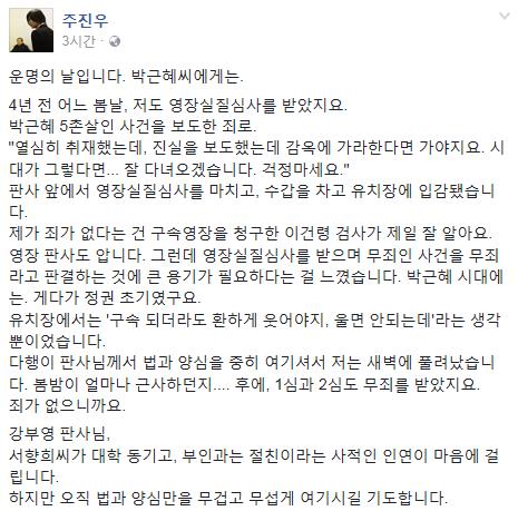그러면서 주 기자는 "강부영 판사님, 서향희씨가 대학 동기고, 부인과는 절친이라는 사적인 인연이 마음에 걸립니다. 하지만 오직 법과 양심만을 무겁고 무섭게 여기시길 기도합니다. 박근혜씨를 위해서도 기도합니다. 부디 국민께 사죄하고 역사에 용서를 구하시길.."이라는 글을 게재했다.