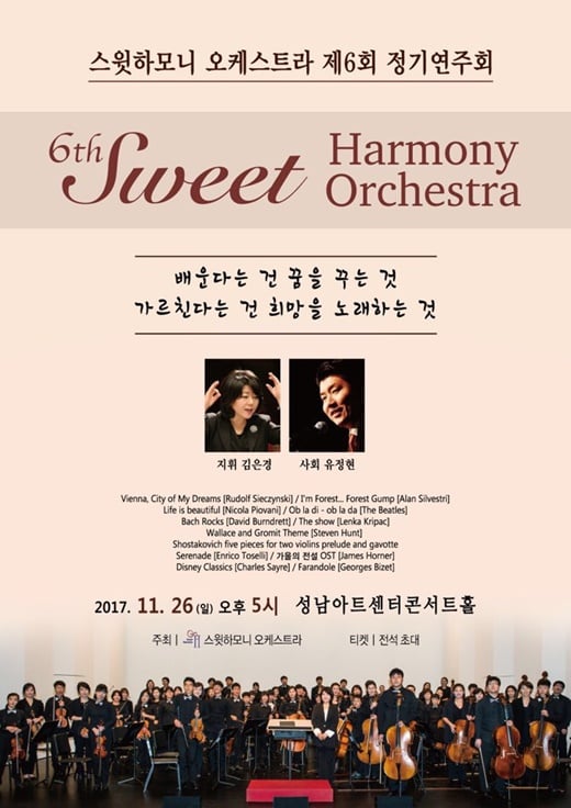 발달장애 오케스트라 스윗하모니(단장 김은경)가 26일 오후 5시 성남아트센터 콘서트홀에서 6번째 정기연주회를 갖는다.