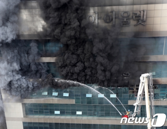 울산 남구 삼산동에 위치한 뉴코아아울렛 울산점 10층에서 화재가 발생해 소방대원들이 진화작업을 하고 있다.