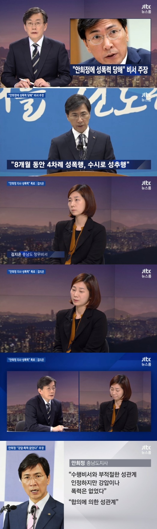 안희정 지사는 이날 성폭행 의혹에 휩싸였다. 이날 방송된 JTBC '뉴스룸'에서 손석희 앵커는 안희정 충남지사에게 성폭행을 당했다고 주장하는 현직 충청남도 정무비서 김지은씨의 인터뷰를 전했다.