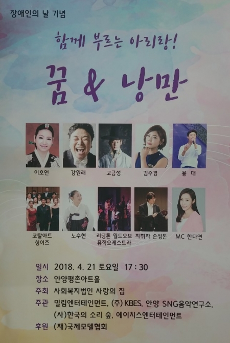 제 38회 장애인의날 기념 음악회 ‘꿈&낭만’콘서트가 21일 오후 5시 30분부터 안양평촌아트홀에서 열린다.