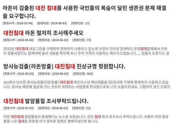 이외에도 "대진 침대 라돈 철저히 조사해주세요" "라돈이 검출된 대진 침대를 사용한 국민들의 목숨이 달린 생존권 문제 해결을 요구합니다" 등 관련 청원이 줄을 잇고 있다.