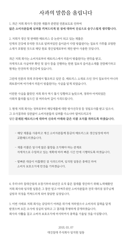 이어 "이러한 사실을 몰랐으며 경위가 어찌되었든 사회적 물의를 일으킨 점 머리숙여 깊이 사죄드린다"며 "문제가 된 매트리스에 대해 신속히 리콜 조치를 취하겠다"고 전했다.