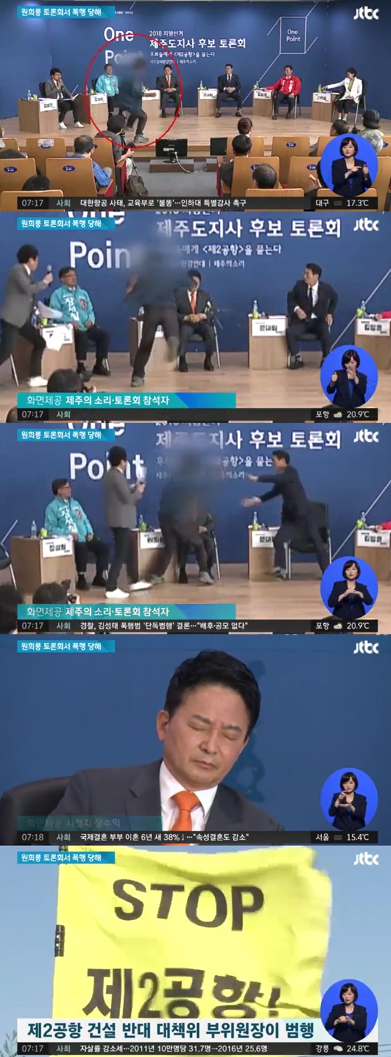 제주도지사 후보 토론회에서 무소속 원희룡 예비 후보가 제2 제주공항 성산읍 건설에 반대하는 제주주민에게 폭행 당하는 일이 벌어졌다.