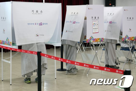 6·13 지방선거 사전투표일인 8일 오후 대구 남구 대명5동행복자치센터에 마련된 사전투표소에서 한국불교대학 대관음사 회주 우학스님과 대중스님들이 투표에 참여하고 있다./사진=뉴스1