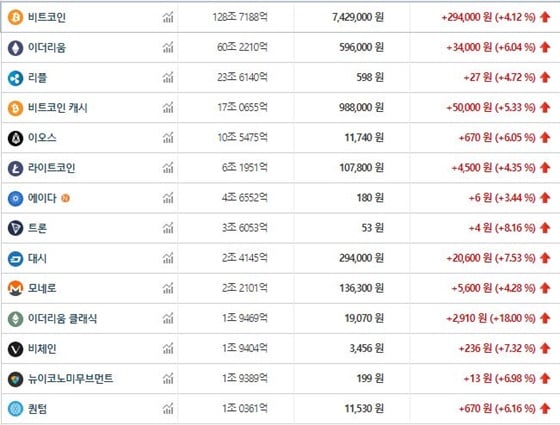 이더리움은 6.04% 상승해 59만 6000원, 리플은 4.72% 올라 598원이다. 특히 이더리움 클래식은 18% 폭등해 1만 9070원에 거래되고 있다.