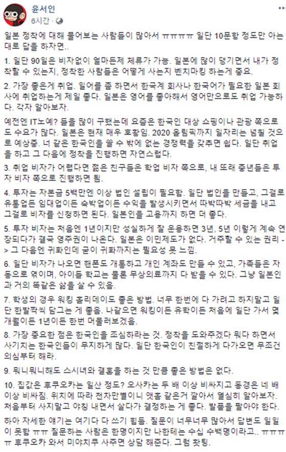 윤서인은 해당 글에서 "2020년 올림픽까지 일본에 일자리는 넘칠 것"이라면서 "당신 같은 한국인을 쓸 수밖에 없는 경쟁력을 갖추면 취업은 쉽다. 이후 정착을 진행하면 자연스럽다"라고 말했다. 이어 법인 설립과 워킹홀리데이를 추천했다.