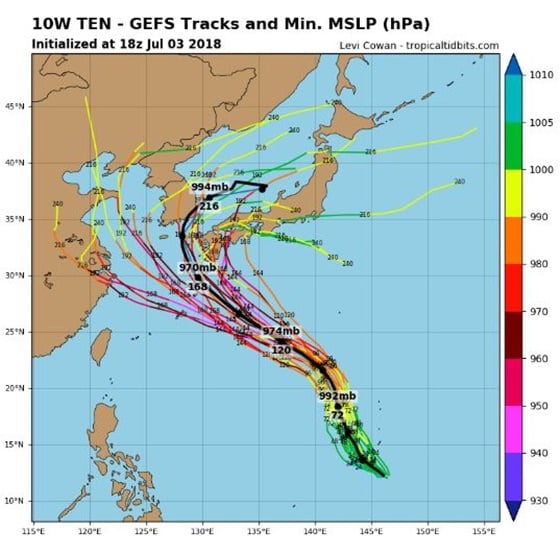 괌 주변에서 발생한 열대저압부가 태풍 '마리아'로 커질 가능성이 높아지고 있다. '쁘라삐룬'의 뒤를 이어 북상하고 있는 이 열대저압부는 북서진하며 오키나와 남부까지 진출할 전망이다.