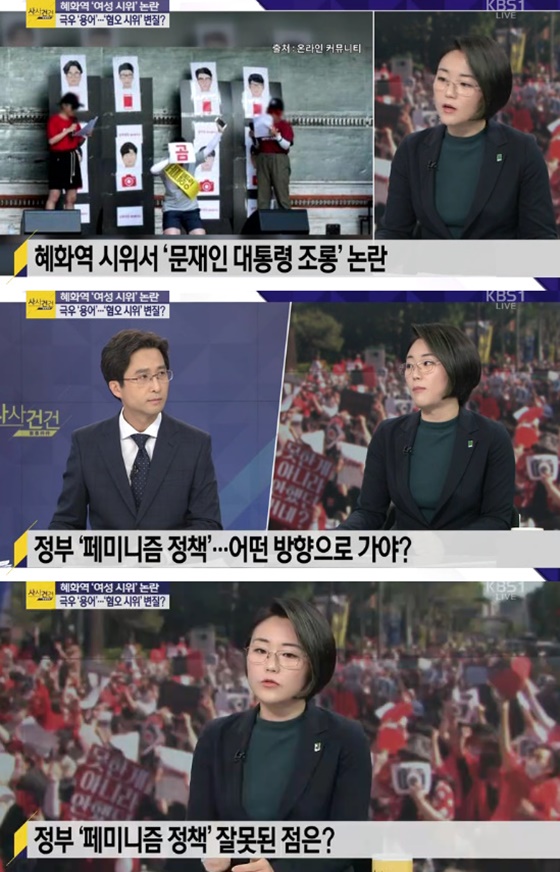 신지예 전 후보는 지난 9일 방송된 KBS 1TV '사사건건'에 출연해 문제가 된 구호에 대해 "제가 알고 있기로는 '일베'라는 단체에서 쓰는 그 단어는 주최측이 사용한 것이 아니라 참가자가 쓴 것으로 알고 있다"라며 이같이 말했다.