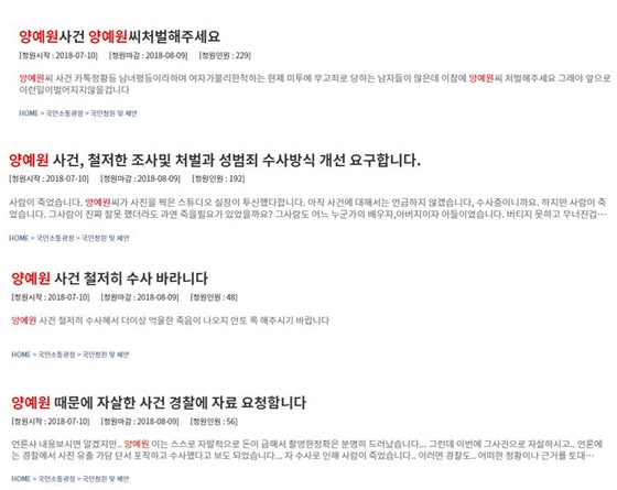 나흘 전 실종됐던 '양예원 사진 유출사건' 피의자 스튜디오 실장 정모씨(47)의 시신이 발견된 가운데 양예원을 비난하는 청와대 국민청원이 쏟아졌다.