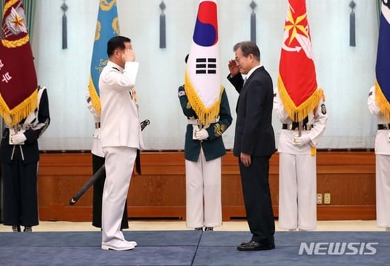 문재인 대통령이 심승섭 신임 해군참모총장으로부터 보직 및 진급 신고를 받고 있는 모습. /사진=뉴시스