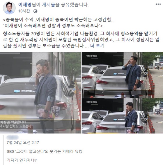 더불어 이재명 지사는 한 인터넷신문 발행인이 쓴 'SBS 그것이 알고 싶다 웃기는 카메라 워킹'이라는 글을 공유했다. 해당 글에는 '그알' 속 PD가 이재명 지사와 통화하는 모습이 담긴 방송캡처와 함께 '해당 장면은 연출된 것'이라는 주장이 담겼다.