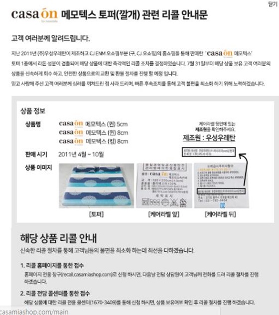 원자력안전위원회는 해당 상품군을 조사한 결과 일부 폼목에서 '생활주변 방사선 안전관리법’ 안전기준 부적합 판정이 나와 리콜 처분을 내렸다. 까사온 메모텍스 토퍼 13종 가운데 3종이 라돈 기준치를 초과했다.