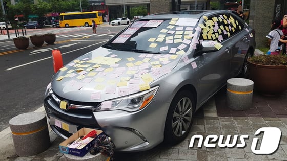 뉴스1에 따르면 지난 29일 송도에 위치한 한 아파트 단지 주민들이 지하주차장 입구를 막은 승용차에 비난 메세지가 담긴 포스트잇을 부착했다.