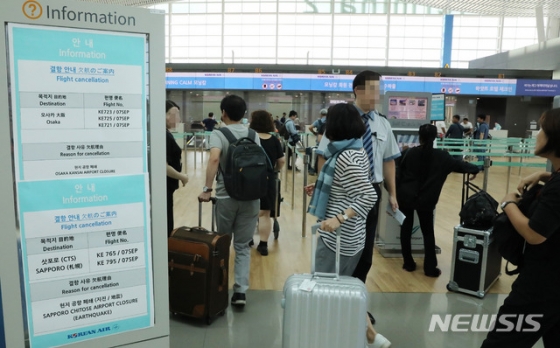 1일 항공업계에 따르면 대한항공은 일본행 18편을 결항 조치했고, 10편은 지연 운항했다. 현재는 일본으로 향하는 모든 노선이 정상 운항되고 있는 중이다.