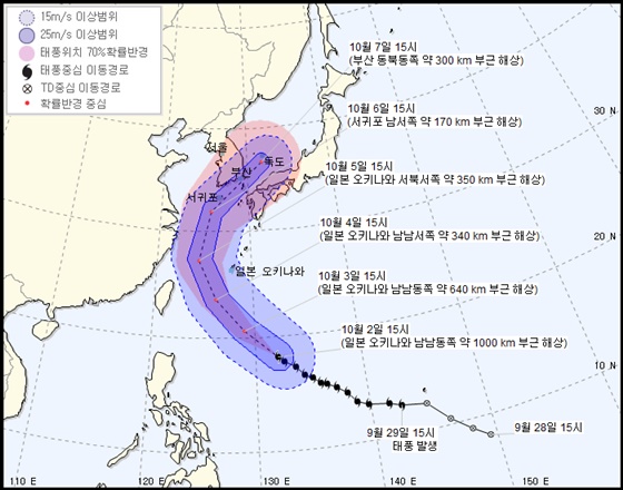 기상청은 "콩레이는 북태평양고기압 가장자리를 따라 계속 북서진한 뒤 5일 쯤 점차 방향을 바꿔 6일~7일 사이 남해상을 지날 것으로 보인다"라고 설명했다.