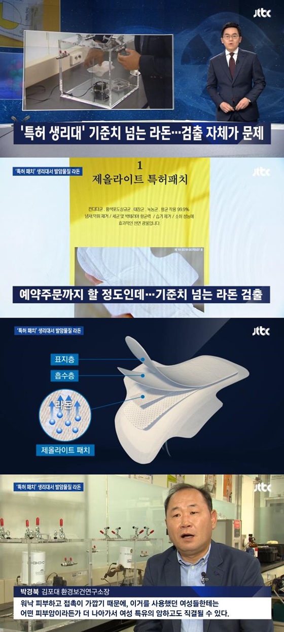 이날 뉴스룸은 생리대 제품 중 하나인 '오늘습관'에서 흡수층에 있는 제올라이트 패치에서 기준치 148Bq의 10배가 넘는 라돈이 검출됐다고 밝혔다.