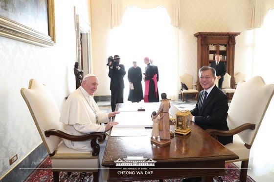 문재인 대통령은 "지난 달 평양을 방문했을 때 김정은 국무위원장에게 교황께서 한반도 평화와 번영에 관심이 많다며 교황을 만나 뵐 것을 제안했다. 김정은 위원장은 바로 그 자리에서 교황께서 평양을 방문하시면 열렬히 환영하겠다는 적극적 환대의사를 받았다"고 말하며 김정은 위원장의 초청의사를 교황에게 전달했다.