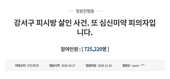 20일 오후 11시 46분 기준으로 지난 17일 청와대 홈페이지 내 국민 청원 게시판에 게시된 '강서구 PC방 살인사건. 또 심신미약 피의자입니다'라는 청원이 72만5220명이 참여했다. 이는 '제주도 불법 난민 신청 문제에 따른 난민법, 무사증 입국, 난민신청허가 폐지/개헌 청원합니다'의 71만4875명보다 높다.