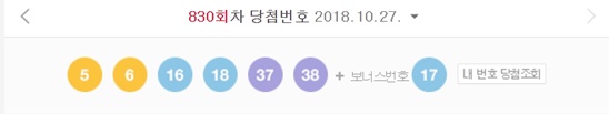 나눔로또 제829회 당첨 1등 번호는 5, 6, 16, 18, 37, 38번으로 뽑혔다. 2등 보너스 번호는 17번이다.