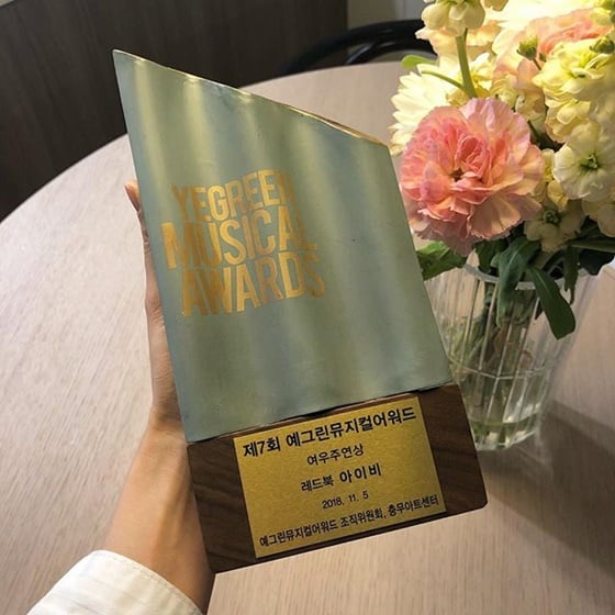 아이비는 6일 자신의 인스타그램에 "어제 예그린뮤지컬어워드에서 여우주연상을 바받았습니다. 어느 덧 뮤지컬 9년차. 아직도 어렵고 두려운 무대지만 뮤지컬이 주는 희열을 무엇에 비교할까요"라는 글과 함께 한 장의 사진을 게재했다.
