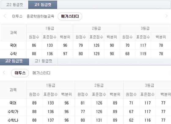 메가스터디에 따르면 고1 수학 영역 1등급은 원점수 88, 표준점수 136, 백분위 97이다. 이어 2등급은 원점수 80, 표준점수 129, 백분위 90, 3등급은 원점수 68, 표준점수 119, 백분위 78이다.