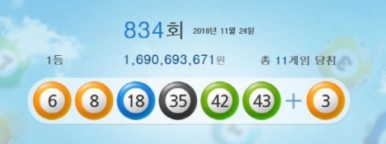 25일 나눔로또에 따르면 지난 24일 추첨결과 제834회 로또 복권 당첨번호는 '6, 8, 18, 35, 42, 43' 번이다. 2등 보너스번호는 3번이다.