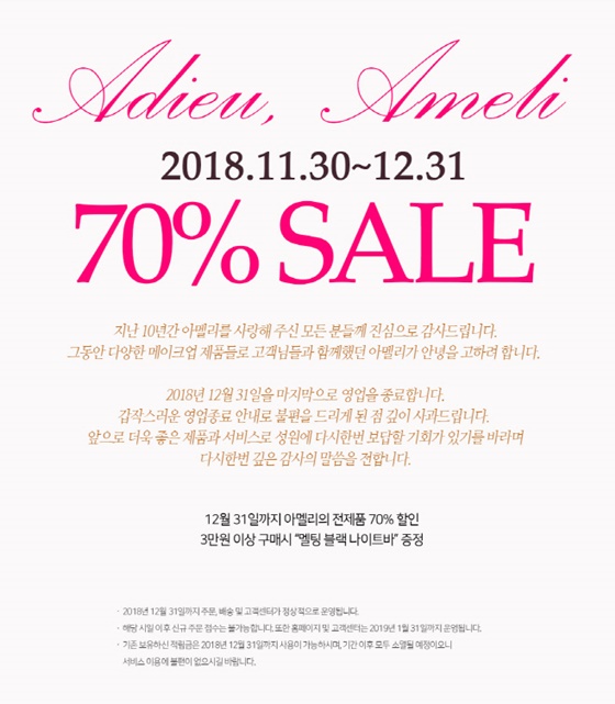 아멜리는 이날부터 오는 12월 31일까지 전제품 70%할인 이벤트를 실시한다. 아울러 기존 보유한 적립금은 12월 31일까지 사용 가능하며 이후에는 소멸된다. 홈페이지 및 고객센터는 2019년 1월 31일까지 운영된다.