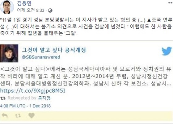 김용민은 지난 2일 자신의 페이스북에 '그것이 알고 싶다' 트윗 함께 "한 사람을 죽이기 위해 집념을 불태우는 그알(그것이 알고 싶다)"이라고 글을 올렸다.