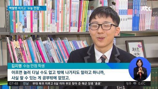 김지명 군은 6일 JTBC와의 인터뷰를 통해 수능 만점의 비결을 털어놨다. 그는 "아프면 놀러 다닐 수도 없고 밖에 나가지도 말라고 하니까 사실 할 수 있는 게 공부밖에 없었다"고 말했다. 또 그는 학교 수업과 인터넷 강의 등으로 수능을 대비했다고 전했다.